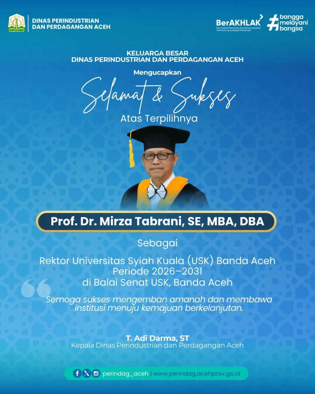 IKLAN DISPERINDAG ACEH – UCAPAN SELAMAT DAN SUKSES PROF. DR. MIRZA TABRANI, SE., M.B.A., D.B.A ATAS TERPILIHNYA SEBAGAI REKTOR USK IKLAN|Februari 2, 2026Februari 21, 2026oleh Penapost Redaksi