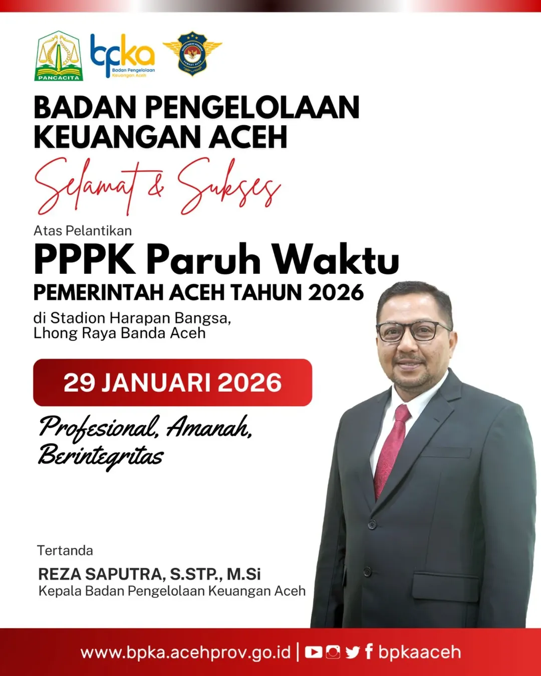 IKLAN BPKA – UCAPAN SELAMAT ATAS PELANTIKAN PPPK PARUH WAKTU PEMERINTAH ACEH TAHUN 2026 IKLAN|Januari 29, 2026Februari 20, 2026oleh Penapost Redaksi