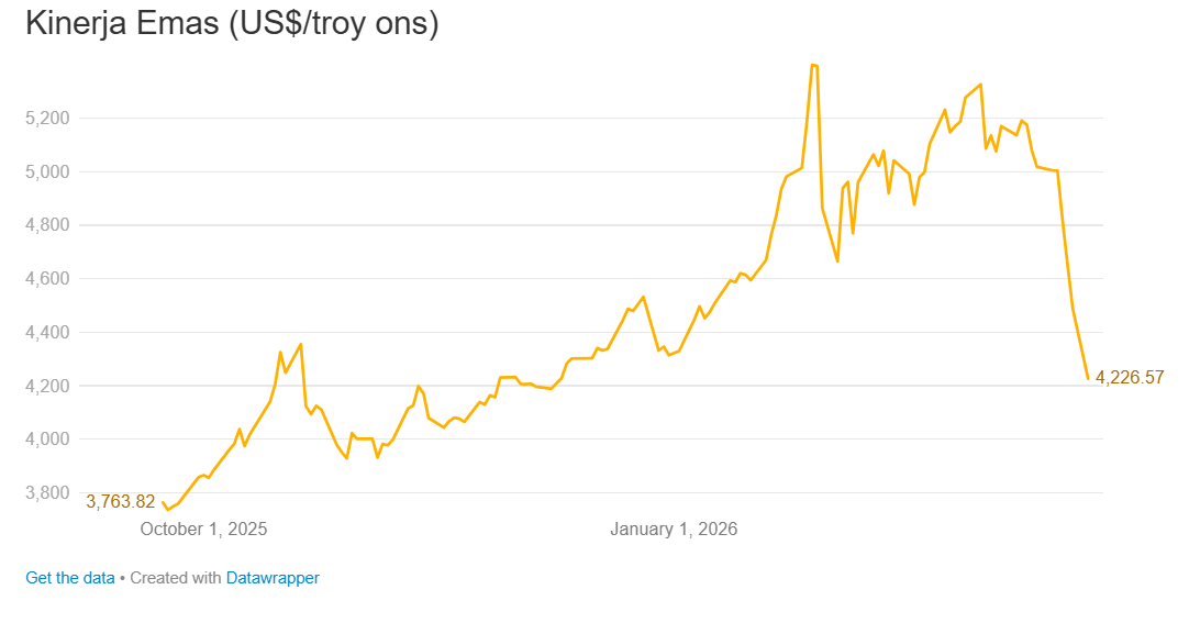 Harga emas pada hari ini bahkan sempat jatuh 7,3% dan diperdagangkan di US$ 4161,89 per troy ons. Level ini adalah yang terendah sejak November 2025.