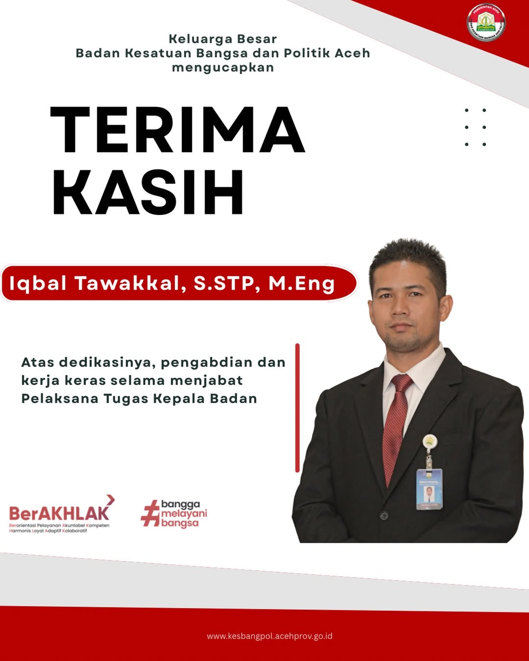 IKLAN BADAN KESBANGPOL ACEH – UCAPAN TERIMAKASIH KEPADA IQBAL TAWAKKAL, S.STP, M.ENG ATAS DEDIKASINYA, PENGABDIAN DAN KERJA KERAS SELAMA MENJABAT PELAKSANA TUGAS KEPALA BADAN