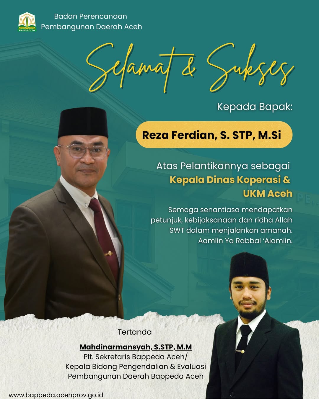 IKLAN BAPPEDA ACEH – UCAPAN SELAMAT KEPADA REZA FERDIAN, S.STP, M.Si ATAS PELANTIKAN SEBAGAI KEPALA DINAS KOPERASI DAN UKM ACEH