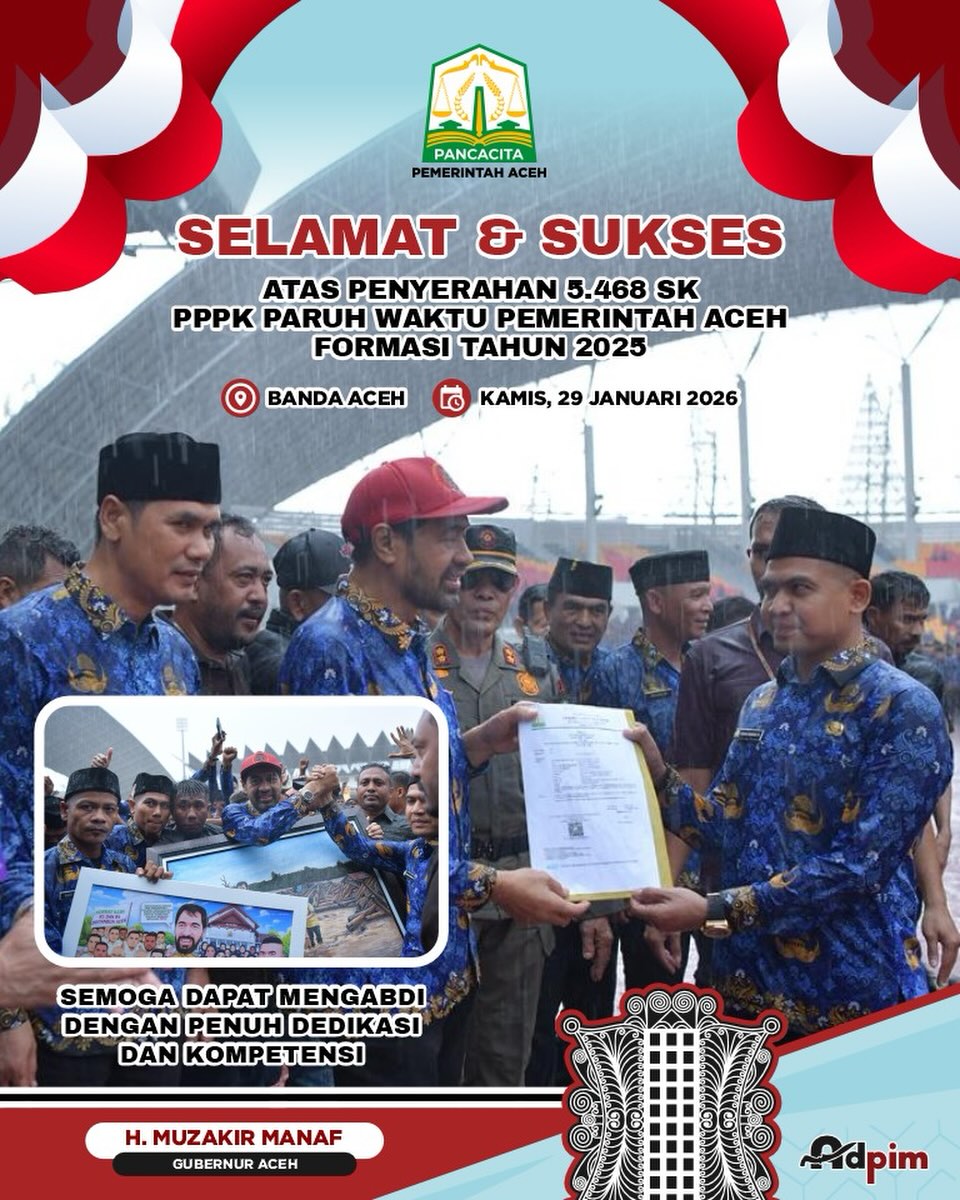 IKLAN BIRO ADPIM – UCAPAN SELAMAT ATAS PELANTIKAN PPPK PARUH WAKTU PEMERINTAH ACEH TAHUN 2026Penapost RedaksiJanuari 29, 2026Februari 20, 2026IKLAN Posting TerkaitIKLAN BAPPEDA ACEH – UCAPAN SELAMAT ATAS PELANTIKAN MIRZA TABRANI, SE., MBA., D.B.A SEDBAGAI REKTOR USKIKLAN BAITUL MAL ACEH – IKLAN LAYANAN TUNAIKAN ZAKATIKLAN DINAS ESDM ACEH – UCAPAN SELAMAT ATAS PELANTIKAN ASNAWI ST, M.S.M SEBAGAI KEPALA DINASIKLAN DINAS ESDM ACEH – UCAPAN TERIMA KASIH KEPADA TAUFIK, ST., M.SI ATAS PENGABDIAN DAN DEDIKASI SEBAGAI KEPALA DINAS ESDM ACEHIKLAN DINAS ESDM ACEH – UCAPAN SELAMAT MEMPERINGATI MALAM NUZULUL QUR’AB 1447 HIJRIAHIKLAN BAPPEDA ACEH – UCAPAN SELAMAT MEMPERINGATI MALAM NUZULUL QUR’AN 1447 HIJRIAHIKLAN DISTANBUN ACEH – UCAPAN SELAMAT KEPADA Dr. Ir. AZANUDDIN KURNIA, S.P., M.P SEBAGAI PLH KEPALA DINASIKLAN DISTANBUN ACEH – UCAPAN TERIMA KASIH KEPADA CUT HUZAIMAH ATAS PENGABDIAN SEBAGAI KADISTANBUN ACEHJangan LewatkanIKLAN BAPPEDA ACEH – UCAPAN SELAMAT ATAS PELANTIKAN MIRZA TABRANI, SE., MBA., D.B.A SEDBAGAI REKTOR USKIKLAN BAITUL MAL ACEH – IKLAN LAYANAN TUNAIKAN ZAKATIKLAN DINAS ESDM ACEH – UCAPAN SELAMAT ATAS PELANTIKAN ASNAWI ST, M.S.M SEBAGAI KEPALA DINASIKLAN DINAS ESDM ACEH – UCAPAN TERIMA KASIH KEPADA TAUFIK, ST., M.SI ATAS PENGABDIAN DAN DEDIKASI SEBAGAI KEPALA DINAS ESDM ACEHIKLAN DINAS ESDM ACEH – UCAPAN SELAMAT MEMPERINGATI MALAM NUZULUL QUR’AB 1447 HIJRIAHIKLAN BAPPEDA ACEH – UCAPAN SELAMAT MEMPERINGATI MALAM NUZULUL QUR’AN 1447 HIJRIAH