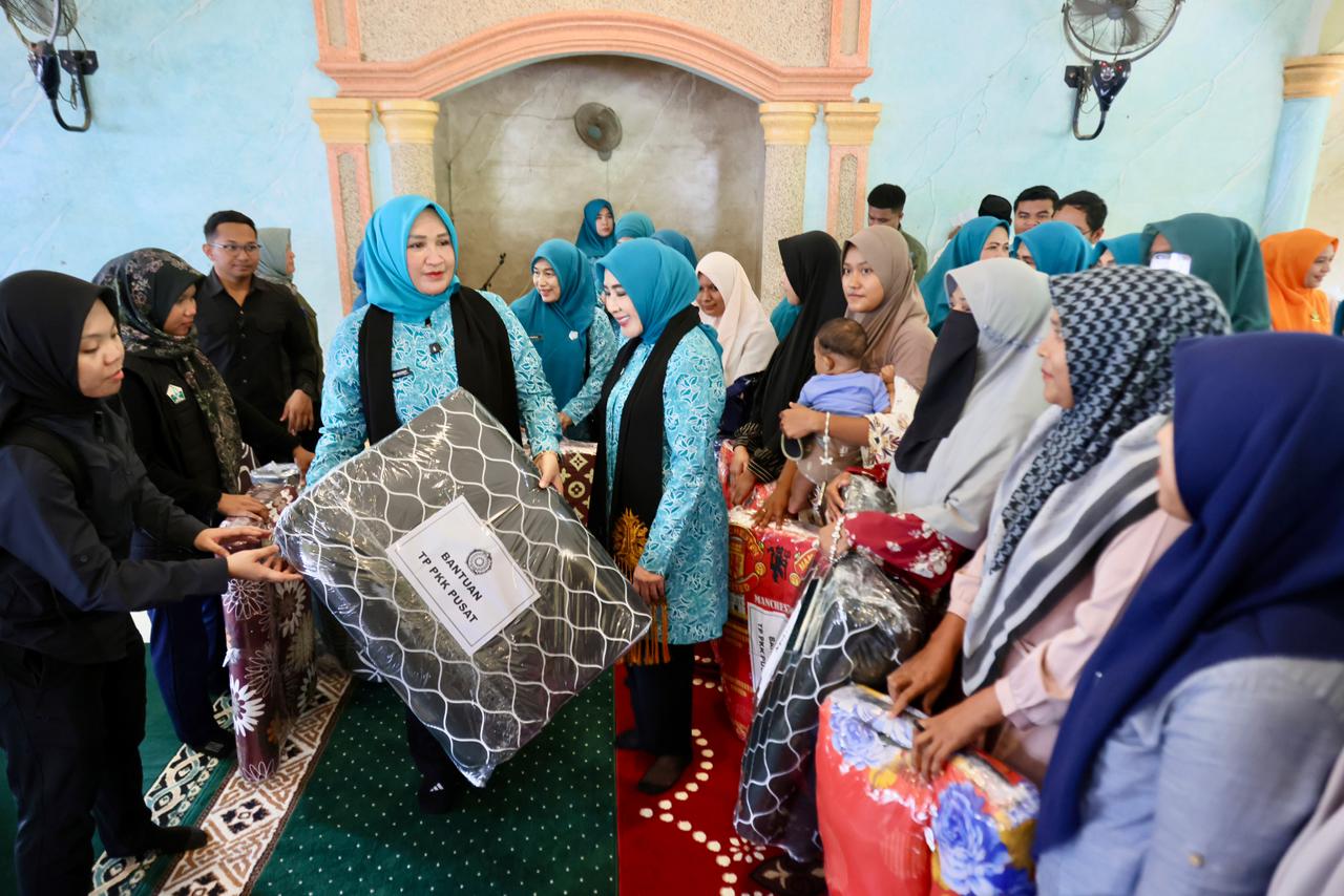 Banda Aceh-Ketua TP PKK Aceh Marlina Muzakir, mendampingi Ketua Umum TP PKK Pusat Tri Tito Karnavian, saat berkunjung dan menyalurkan bantuan ke Gampong Pante Baroe Kumbang Kecamatan Peusangan Siblah Krueng, Senin (9/2/2025).