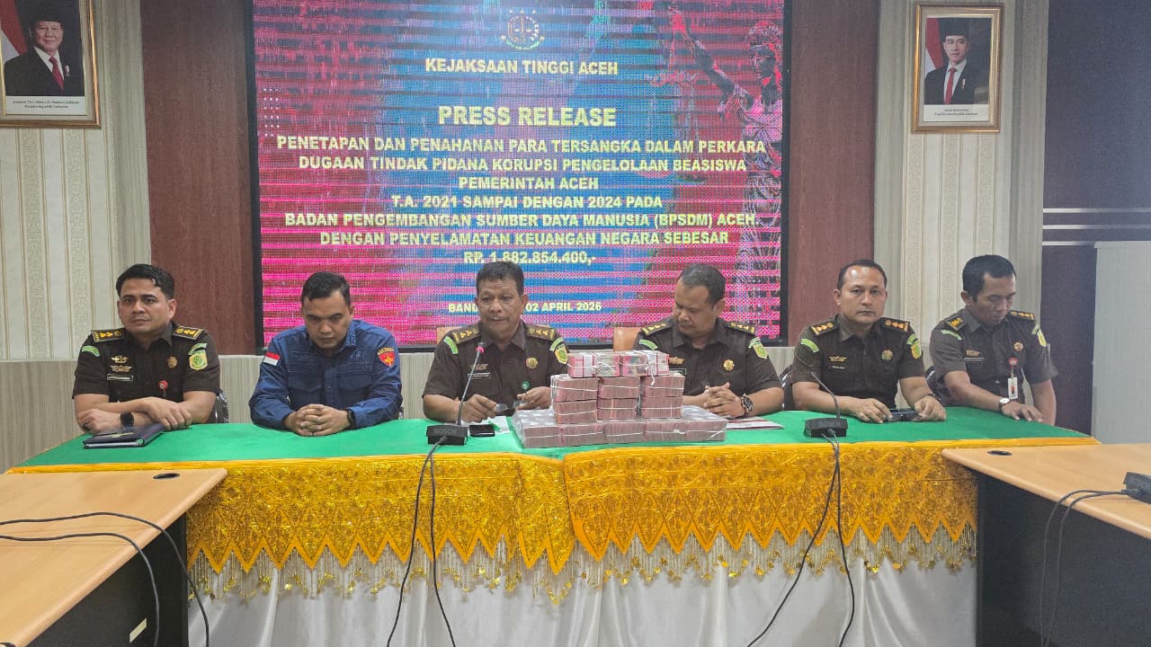 Kasi Penerangan Hukum dan Humas Kejati Aceh, Ali Rasab Lubis, S.H, mengatakan, Tim Penyidik Kejaksaan Tinggi Aceh telah menetapkan dan menahan tersangka dalam perkara dugaan tindak pidana korupsi pengelolaan Beasiswa Pemerintah Aceh Tahun Anggaran 2021-2024 pada Badan Pengembangan Sumber Daya Manusia (BPSDM) Aceh, Kamis, (02/04/ 2026).