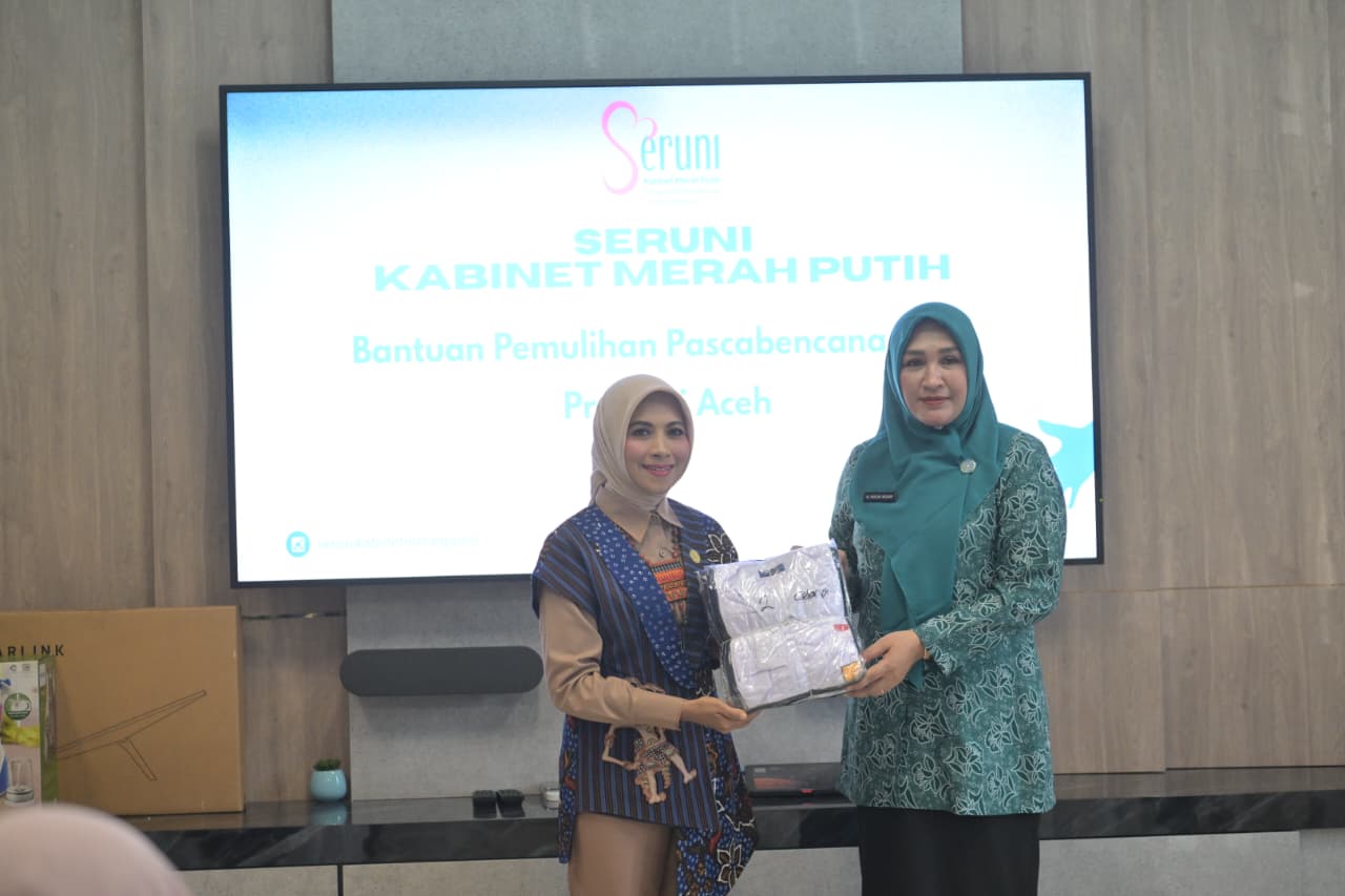 Banda Aceh-Ketua TP PKK Aceh, Marlina Muzakir, didampingi Ketua Staf Ahli TP PKK Aceh, Mukarramah Fadhlullah, serta Ketua Dharma Wanita Persatuan (DWP) Aceh, Malahayati M. Nasir, menghadiri agenda penyerahan bantuan dari Solidaritas Perempuan Indonesia (Seruni) Kabinet Merah Putih bagi masyarakat terdampak bencana di Provinsi Aceh yang berlangsung di Kantor Badan Pengelola Migas Aceh (BPMA), Rabu (11/2/2026).